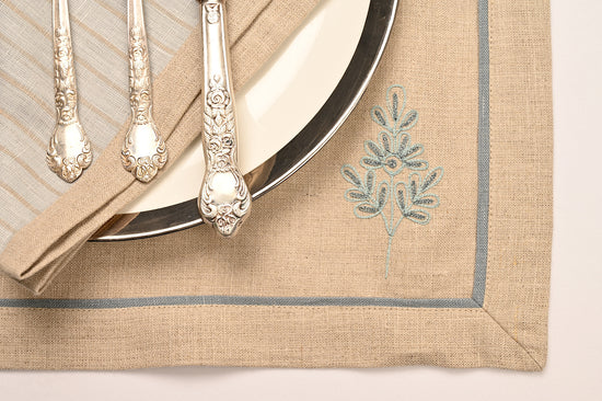 Grey linen embroidered placemats with matching linen napkins.
