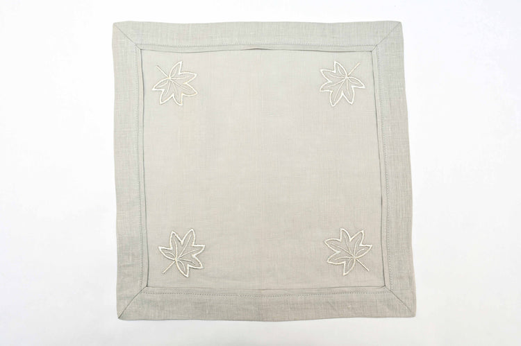 Grey linen cocktail napkins with silver maple leaf embroidery.