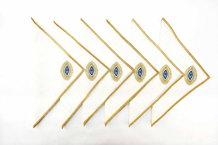 White linen cocktail napkins with gold evil eye embroidered.