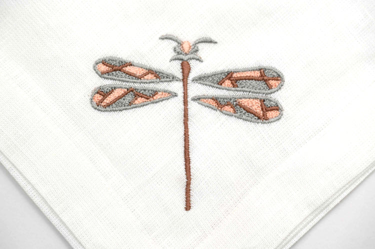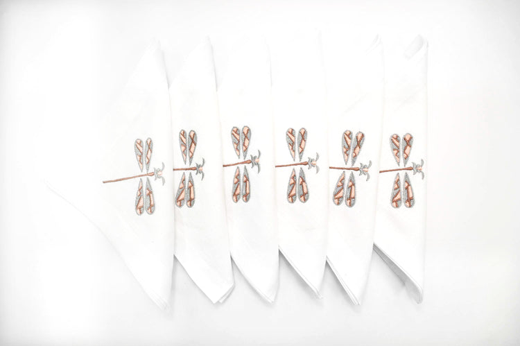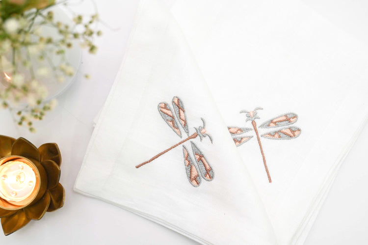 White linen dinner napkins with dragonfly embroidery will add a touch of elegance to your dinning experience.