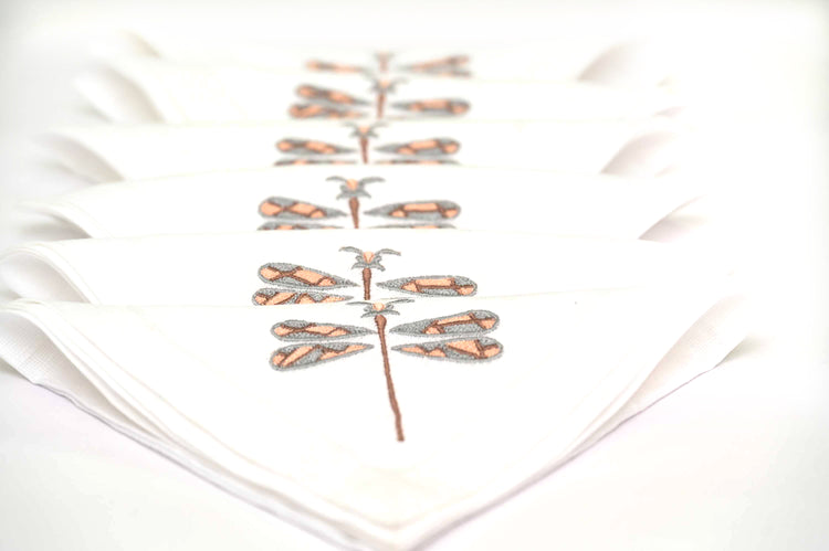 White linen dinner napkins with dragonfly embroidery.