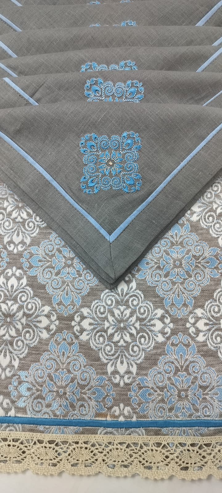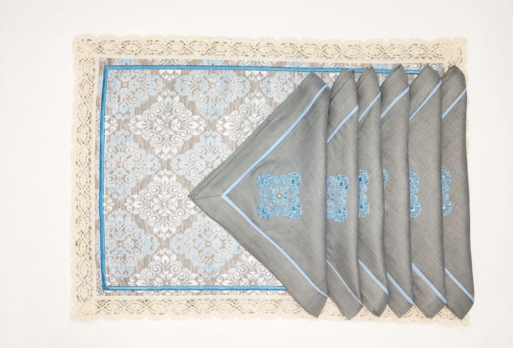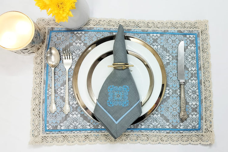 Blue printed laced placemats with blue embroidered linen napkins add a touch of elegance to the table decor .