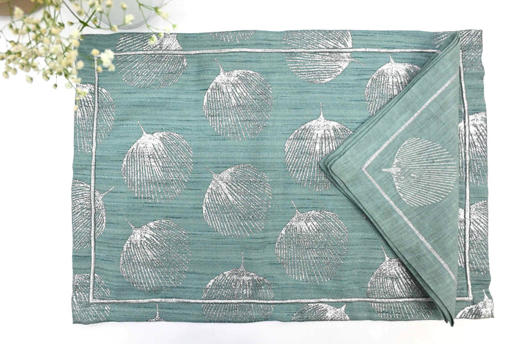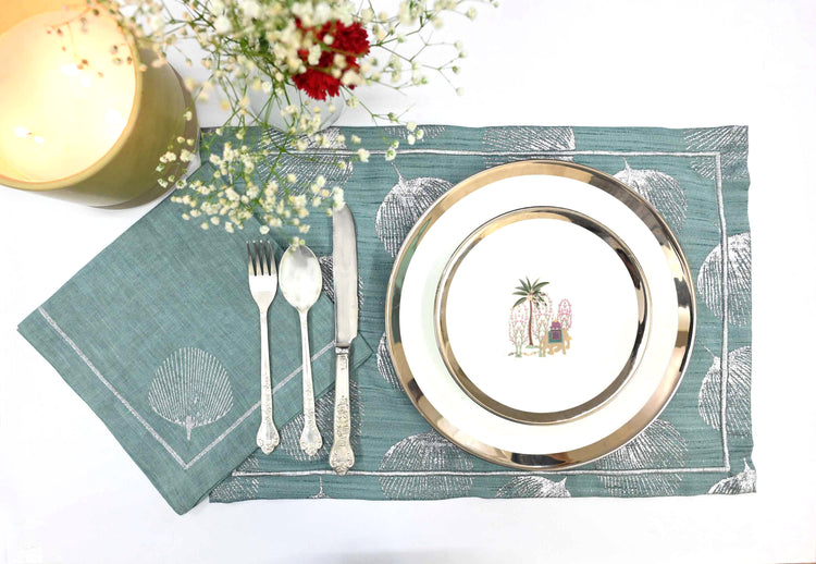 Turquoise printed linen placemats with linen napkins add a perfect fusion of texture and elegance on your dinning table.