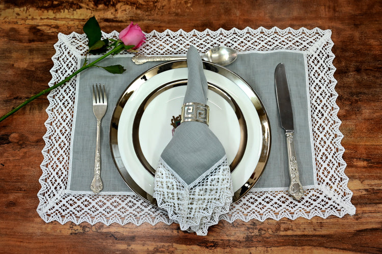Embellish your dining table with placemats and napkins ,crafted with fine Grey linen with white lace border, intricately designed.