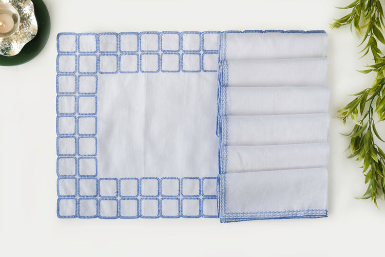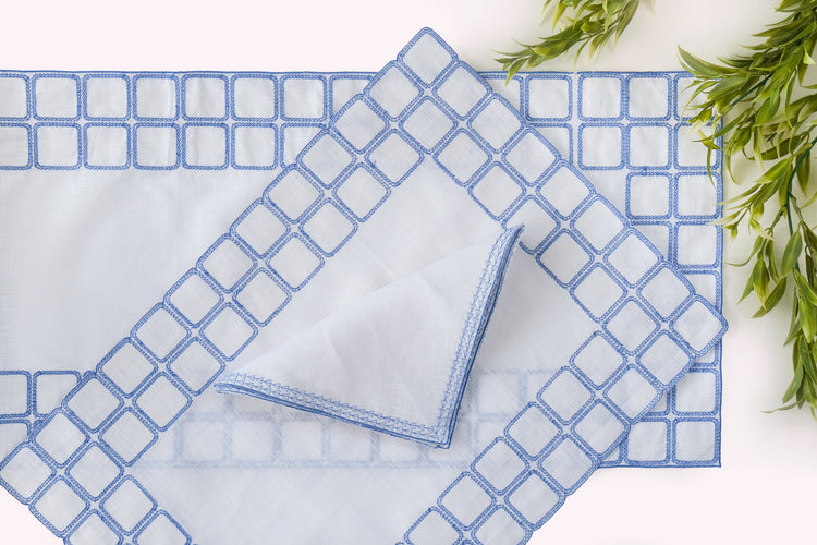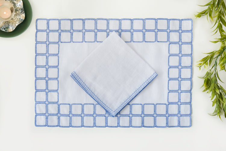 White linen embroidered placemats with matching linen napkins.