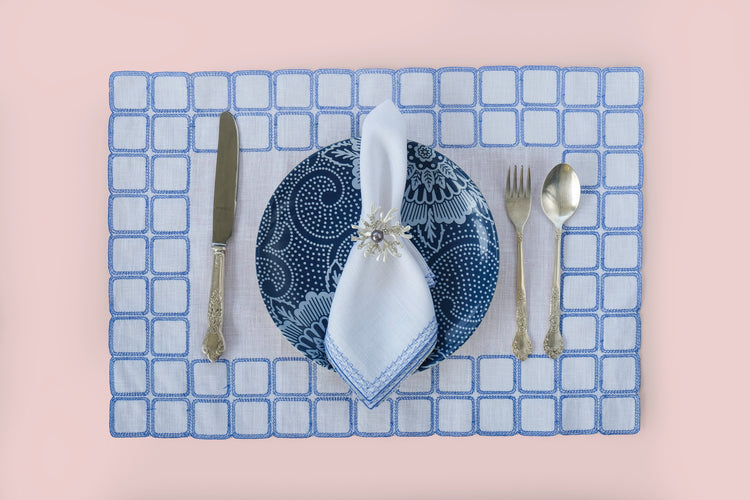 Our new white linen embroidered placemats with matching linen napkins make a trendy table setting.
