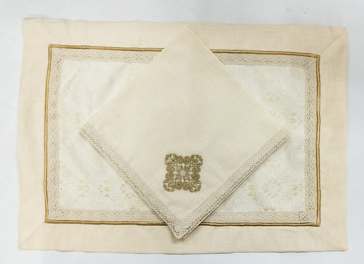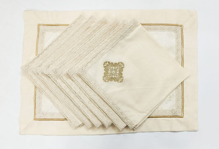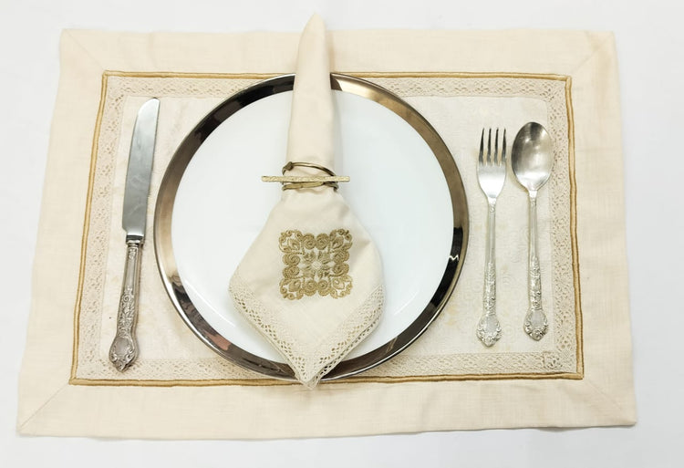 Cream diamond placemats with cream linen napkins adds a touch of sophistication to any table settings.