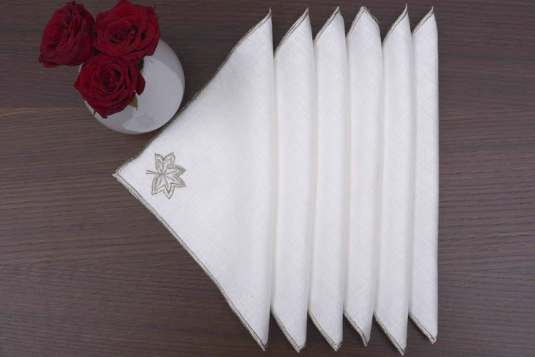 White linen cocktail napkins with gold maple leaf embroidery