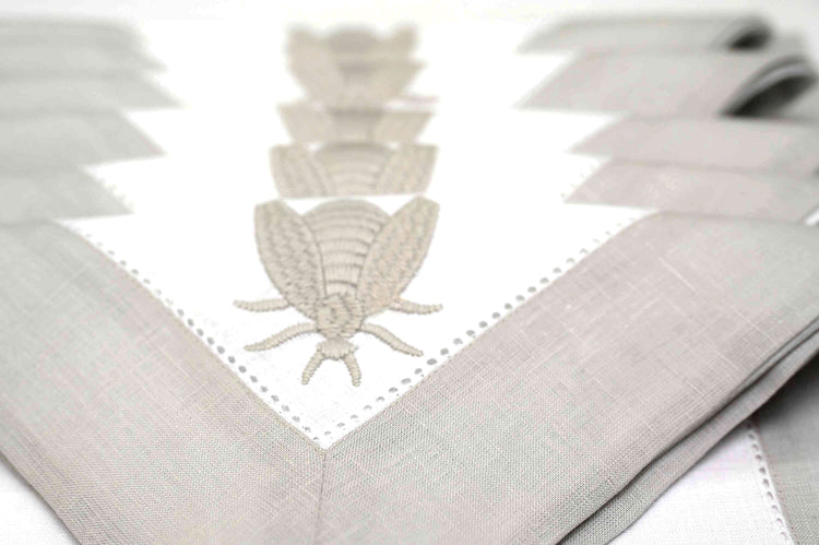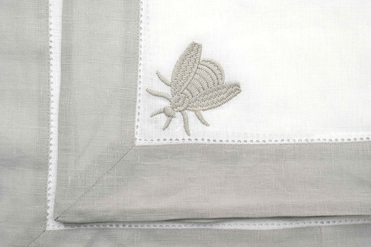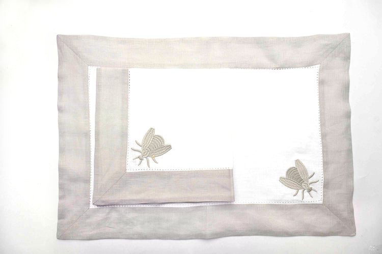 White linen beetle embroidered placemats and napkins with grey border.