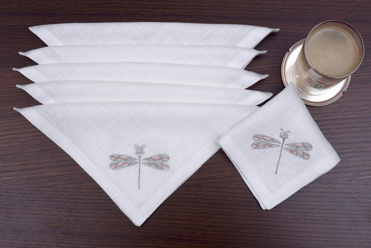 White linen cocktail napkins with dragon fly embroidery