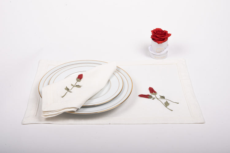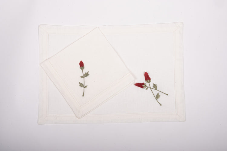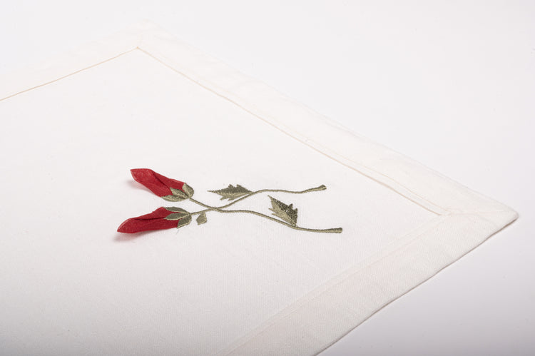 White: Gorgeous white linen placemats and napkins with rose bud appliqued embroidery makes this set an epitome of elegance & sophistication.