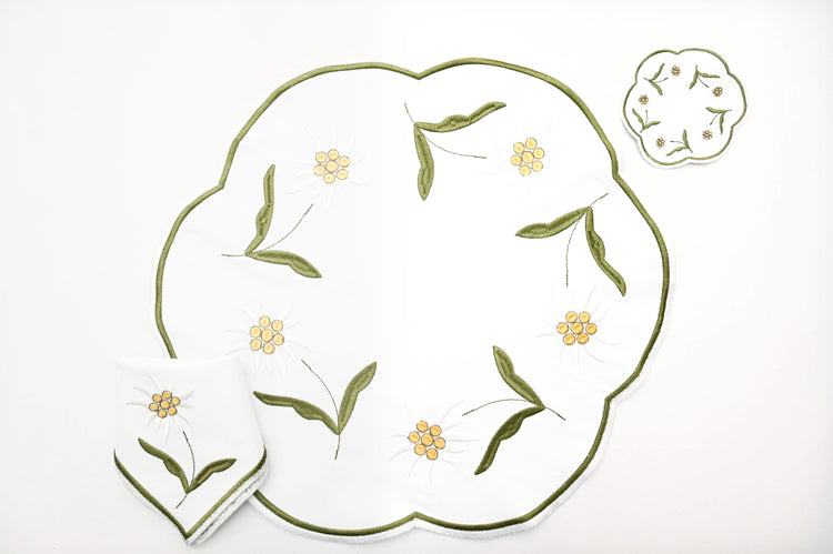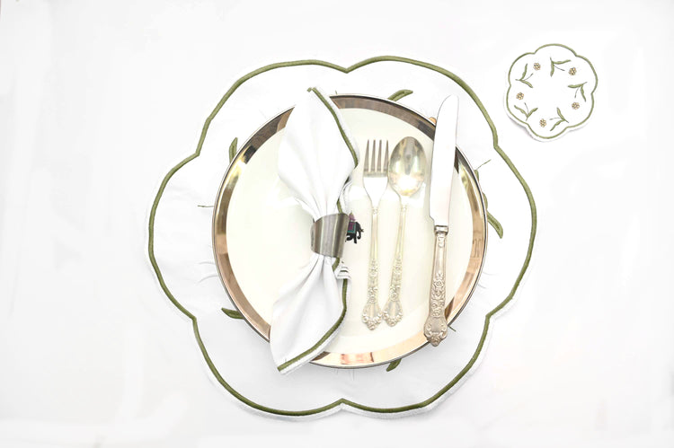 Elevate your dining experience with our exquisite round placemats and napkins with delicate flower embroidery. Matching coasters also available.