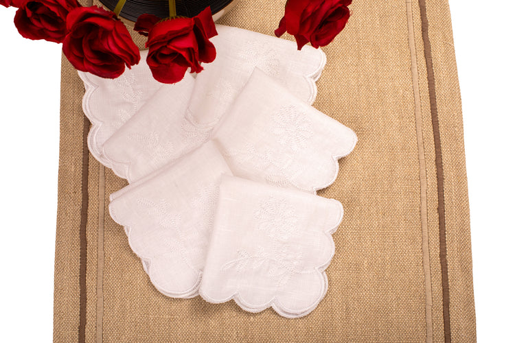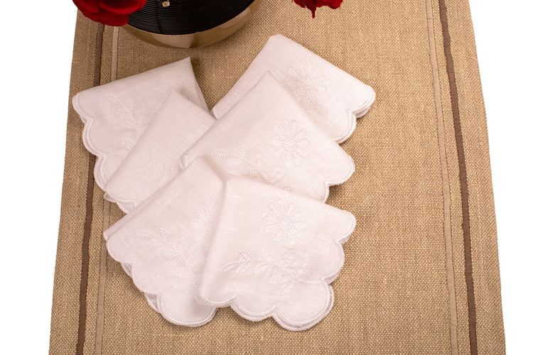 These all white linen scalloped and embroidered cocktail napkin is an all time favourite.