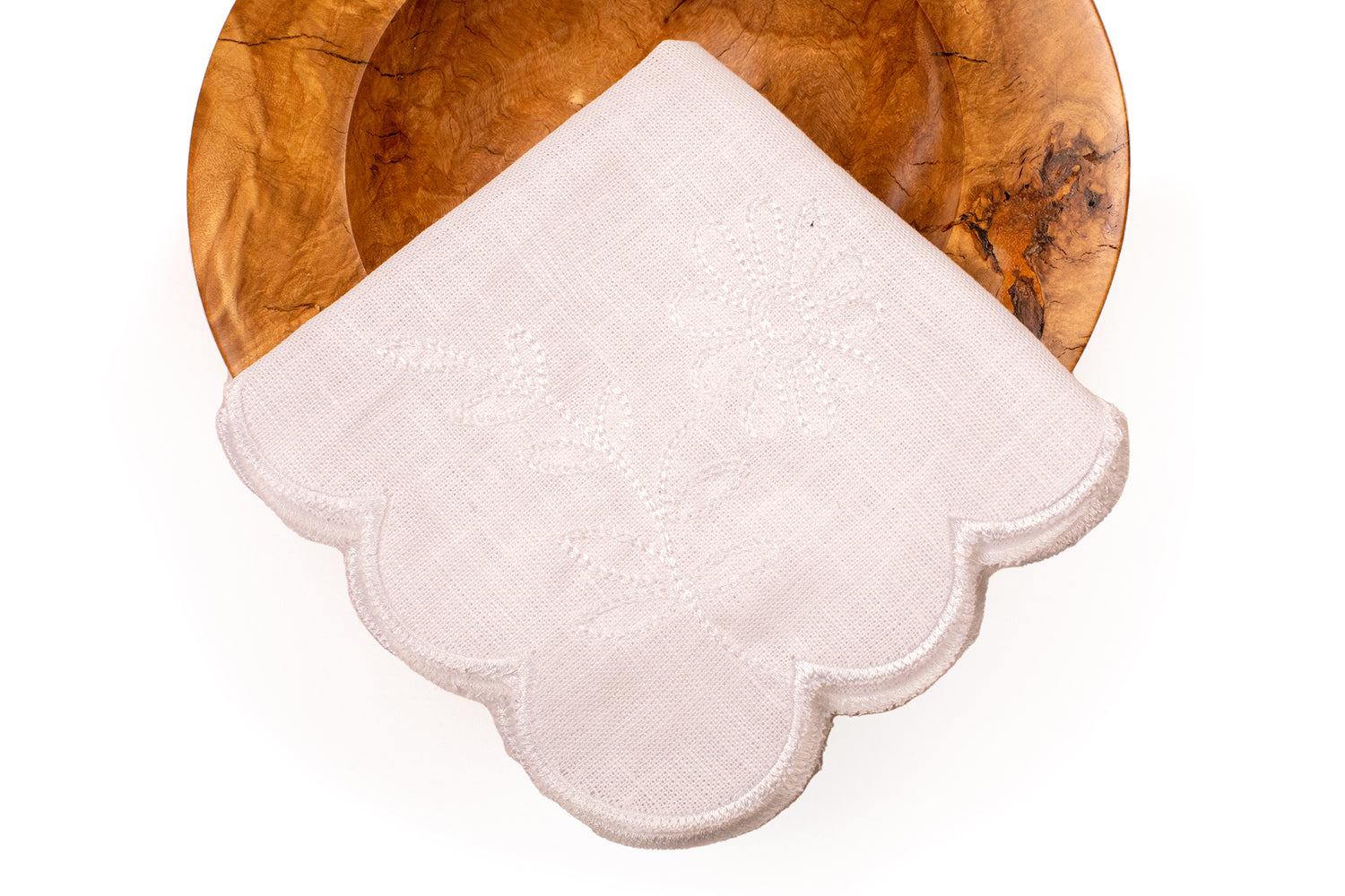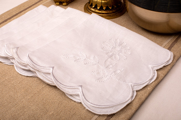 These white linen scalloped and embroidered dinner napkin will get you ready for any high tea.