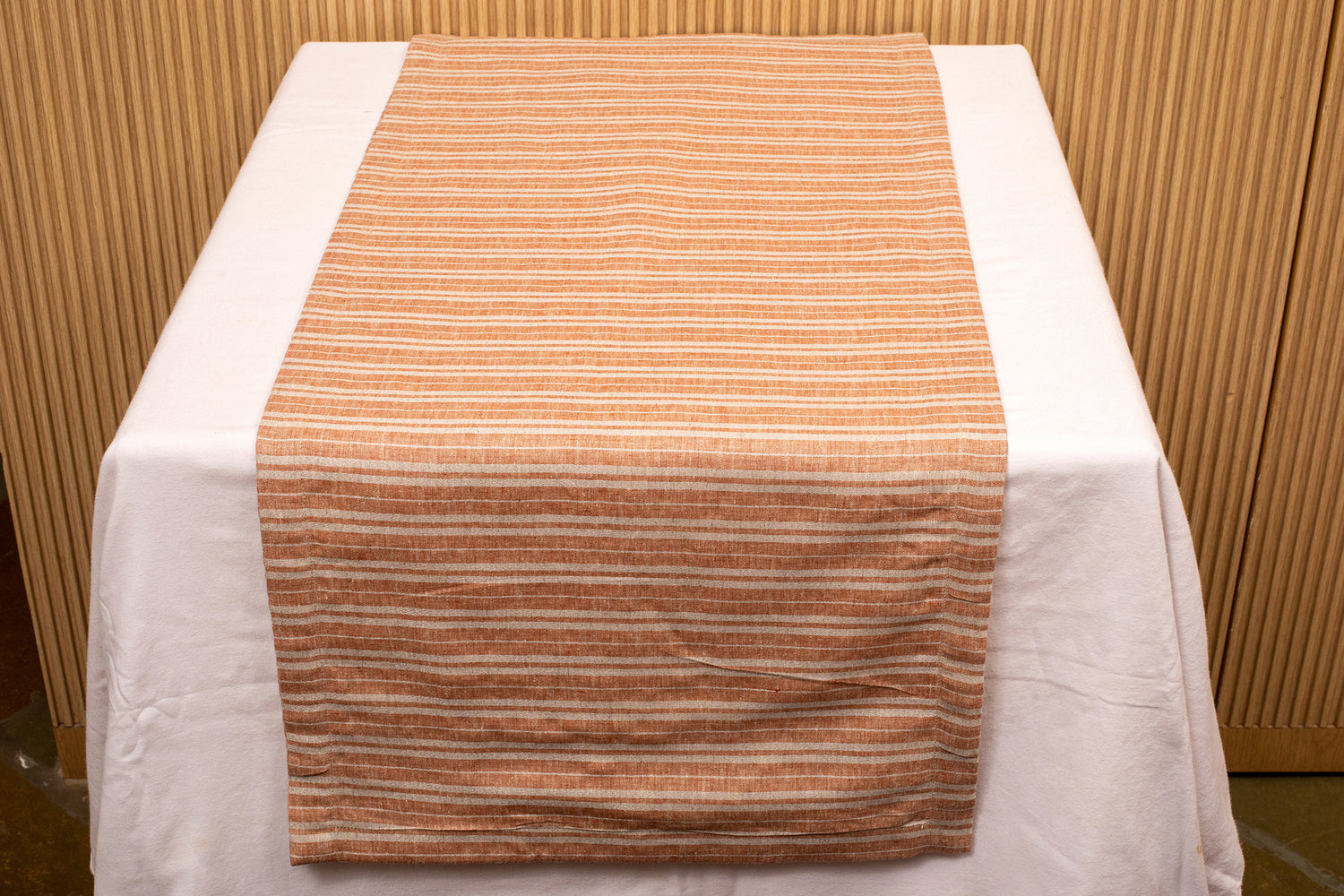 Rust and silver striped linen runner add to the stunning setting of matching mats and napkins.