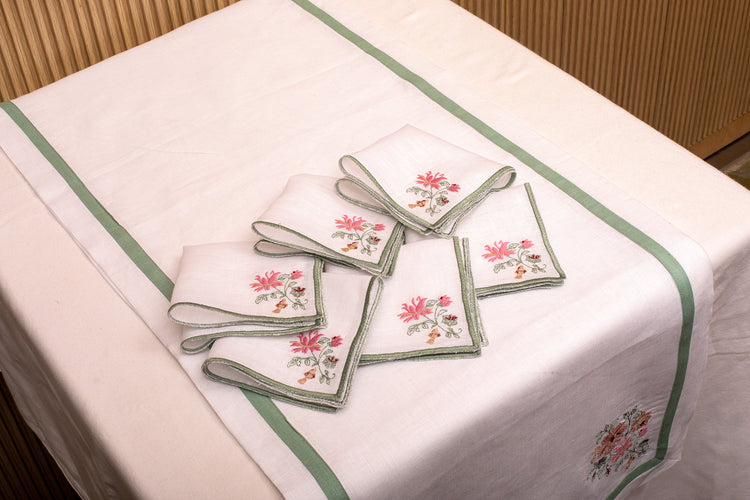 These white linen cocktail napkin with mint green floral detailing are a delight to use.