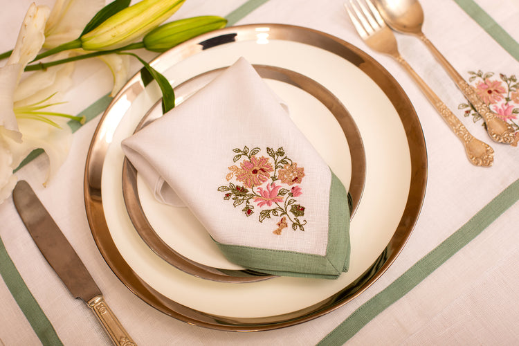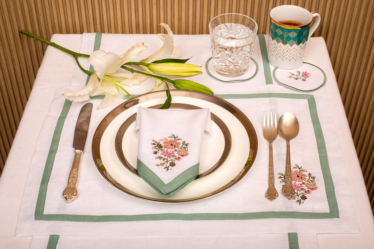 White linen embroidered placemat and napkin with mint green floral detailing.