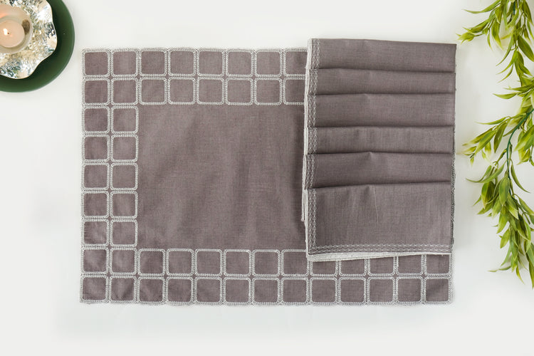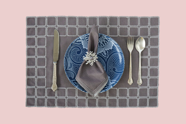 Our new grey linen embroidered placemats with matching linen napkins make a trendy table setting.