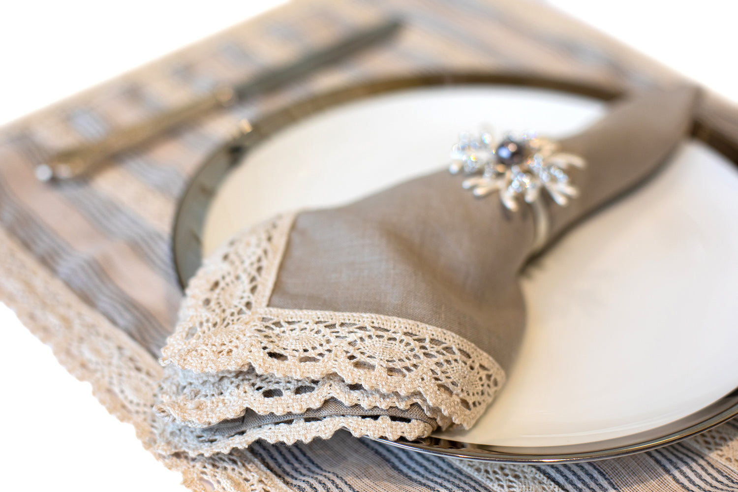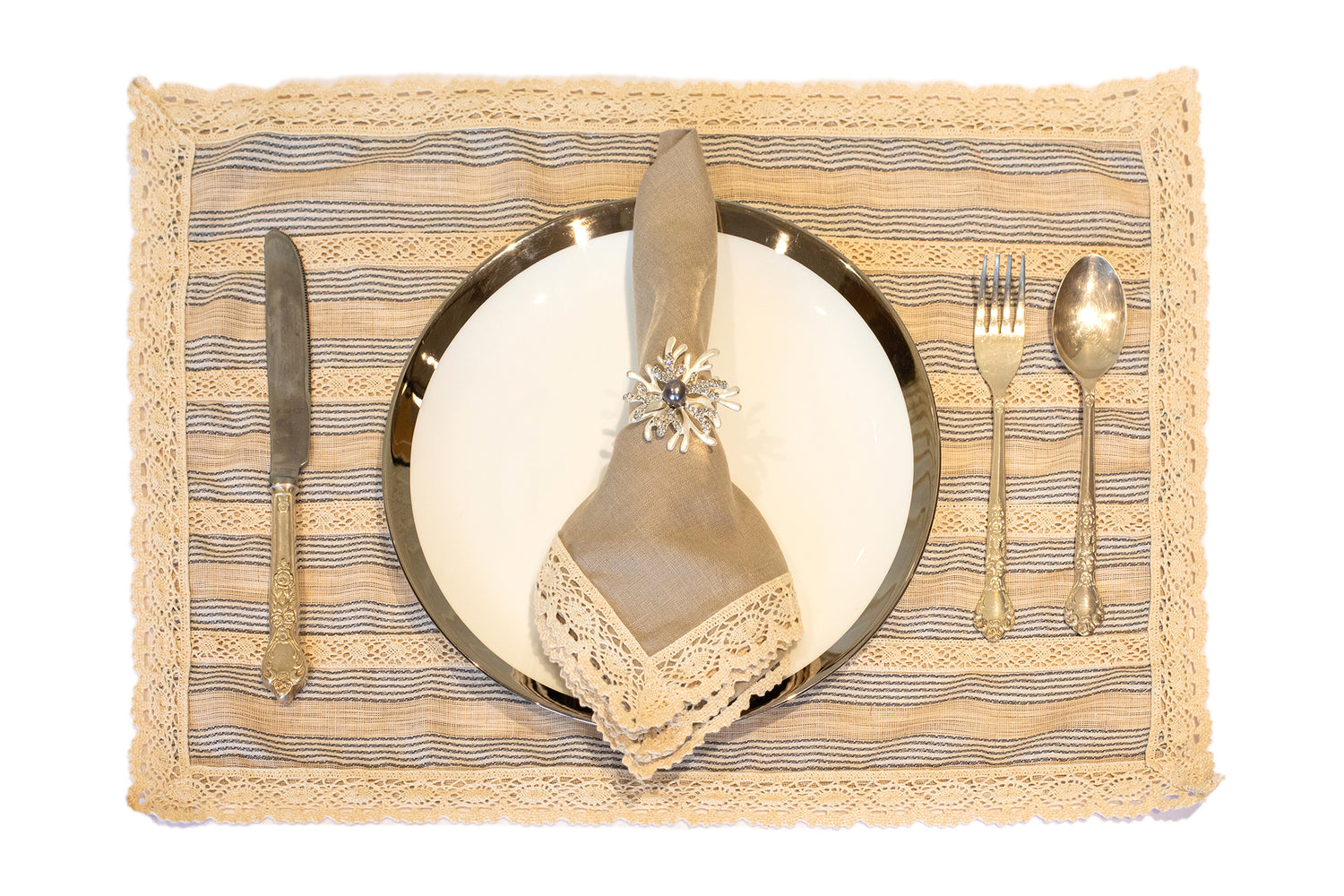 Blue and beige striped linen placemat and napkin with lace detailing.